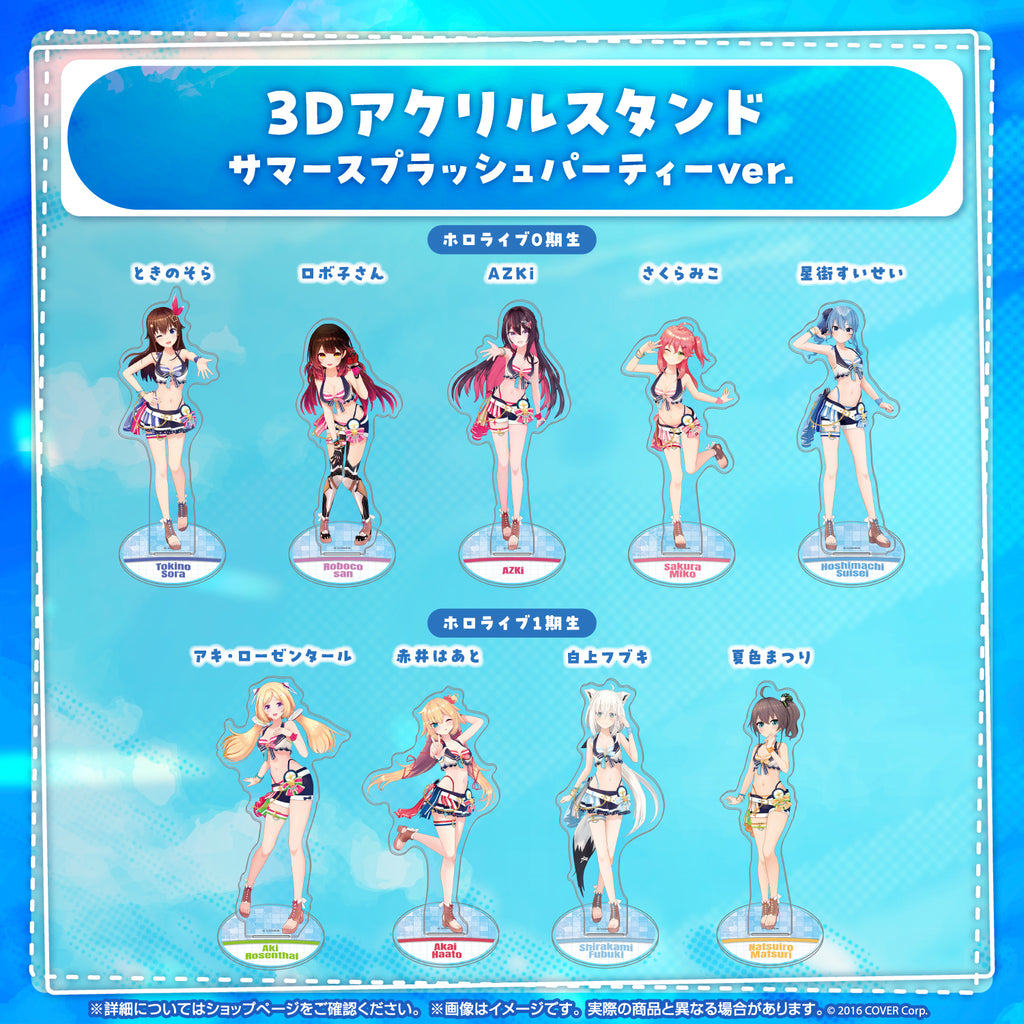 Việc bán lại sản phẩm cho 3D Acrylic Stand Summer Splash Party Ver. được thiết kế dựa trên những bộ trang phục mới đã được tiết lộ trong sự kiện hololive Summer 2023. *Các sản phẩm này là những mặt hàng tương tự được bán tại Comic Market 104. *Danh sách sản phẩm có thể thay đổi. * Ngay cả khi những mặt hàng này đã hết hàng, chúng tôi vẫn có kế hoạch bán lại